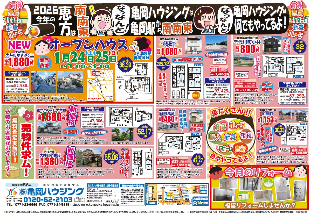 令和8年が始まったと思ったらもう一ヶ月が過ぎ去ろうとしていますね💦皆様いかがお過ごしですか?もう言ってる間に節分がやってきますYO! 今年の恵方は南南東!亀岡ハウジングは亀岡駅から南南東!という事で、南南東に向かって是非ご来店下さい🚙🚙